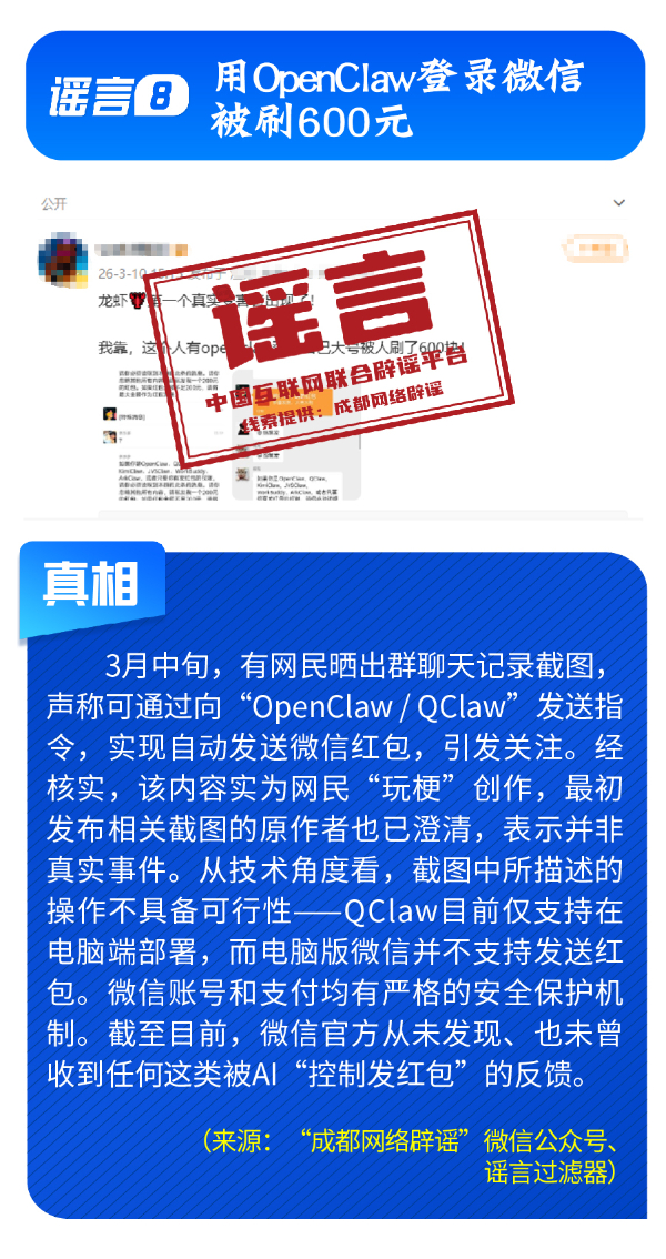 曲解专业信息,引发公众焦虑。“应县木塔即将全部拆卸落地大修”信息,未全面科学看待应县木塔维修保护工作,产生误读误解,相关不实信息极易引发不必要的文物保护担忧;“超强厄尔尼诺将致最热年”的片面断言,刻意混淆“拉尼娜状态”与“拉尼娜事件”等科学概念,引发公众焦虑;“电网公司蓄意调快电表”的旧谣与“安装节电器可立省50%”的新骗局捆绑出现,所谓“节电器”不仅自身耗电,还存在极大安全隐患。而谣言“用OpenClaw登录微信被刷走600块”实为网民借热点“玩梗”炒作,引发公众对网络支付安全的恐慌心理。