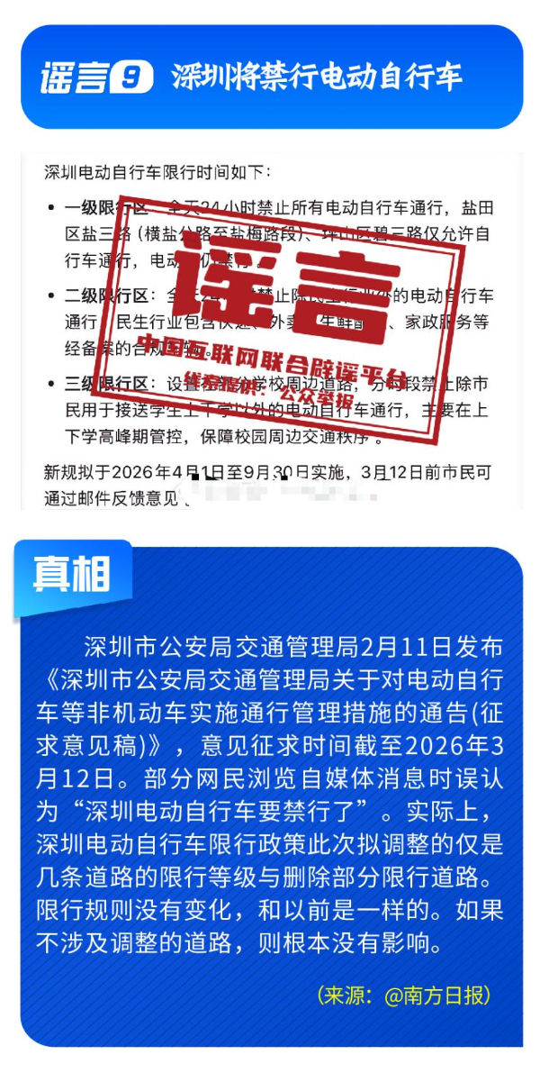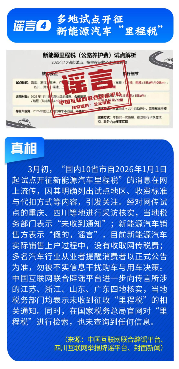 伪造政策文件,扰乱市场预期。《七部门重磅发布AI安全治理三年行动计划》完全是自媒体凭空杜撰,工信部等部门公开表示并无相关文件;“科大讯飞向政府备案裁员30%”系网民为博关注而捏造;“农业银行”发送高额贷款短信实为营销号冒名发送,并非银行官方行为;“深圳将禁行电动自行车”是对管理措施征求意见稿的误读;“多地试点开征新能源汽车‘里程税’”则列举虚假试点地区与收费标准,已被多地税务部门明确予以否认。